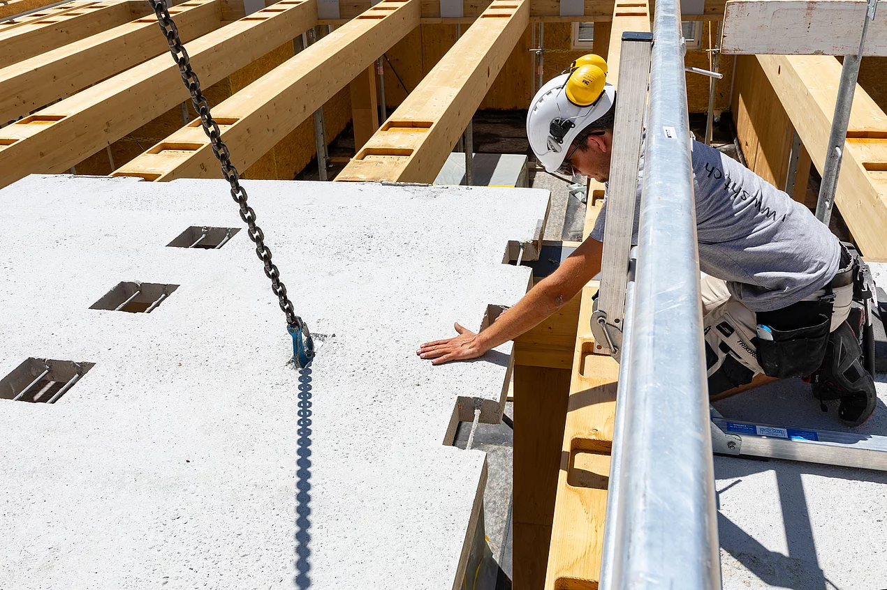 Wenn Holz auf Beton trifft, entsteht eine innige Verbindung. Wilma - als nachhaltiges System für die Zukunft des Bauens entwickelt - vereint souverän alle Vorteile der beiden Materialien Holz und Beton. Das Geheimnis dieser Verbindung? Es lüftet sich auf der Baustelle: Vorgefertigte und direkt auf den Bauplatz gelieferte Beton-Fertigteile werden vor Ort mit den Holzbauteilen durch einen Nockenverguss verbunden. Der hybride Verbund wird zum Hochleistungsdeckensystem mit den Hauptnutzungsbereichen Statik, Brandschutz und Schallschutz. Der Baufortschritt wird nicht unterbrochen, es gelangt kaum Feuchtigkeit ins Gebäude. Das überzeugende Resultat: Sie sparen Zeit. Sie sparen Geld. Wenn Holz und Beton sich verbinden, vernetzen sich ihre Vorteile zu einem leistungsstarken System und das über grosse Distanzen: Wilma überbrückt Spannweiten bis etwa 10 Meter, manchmal auch mehr.