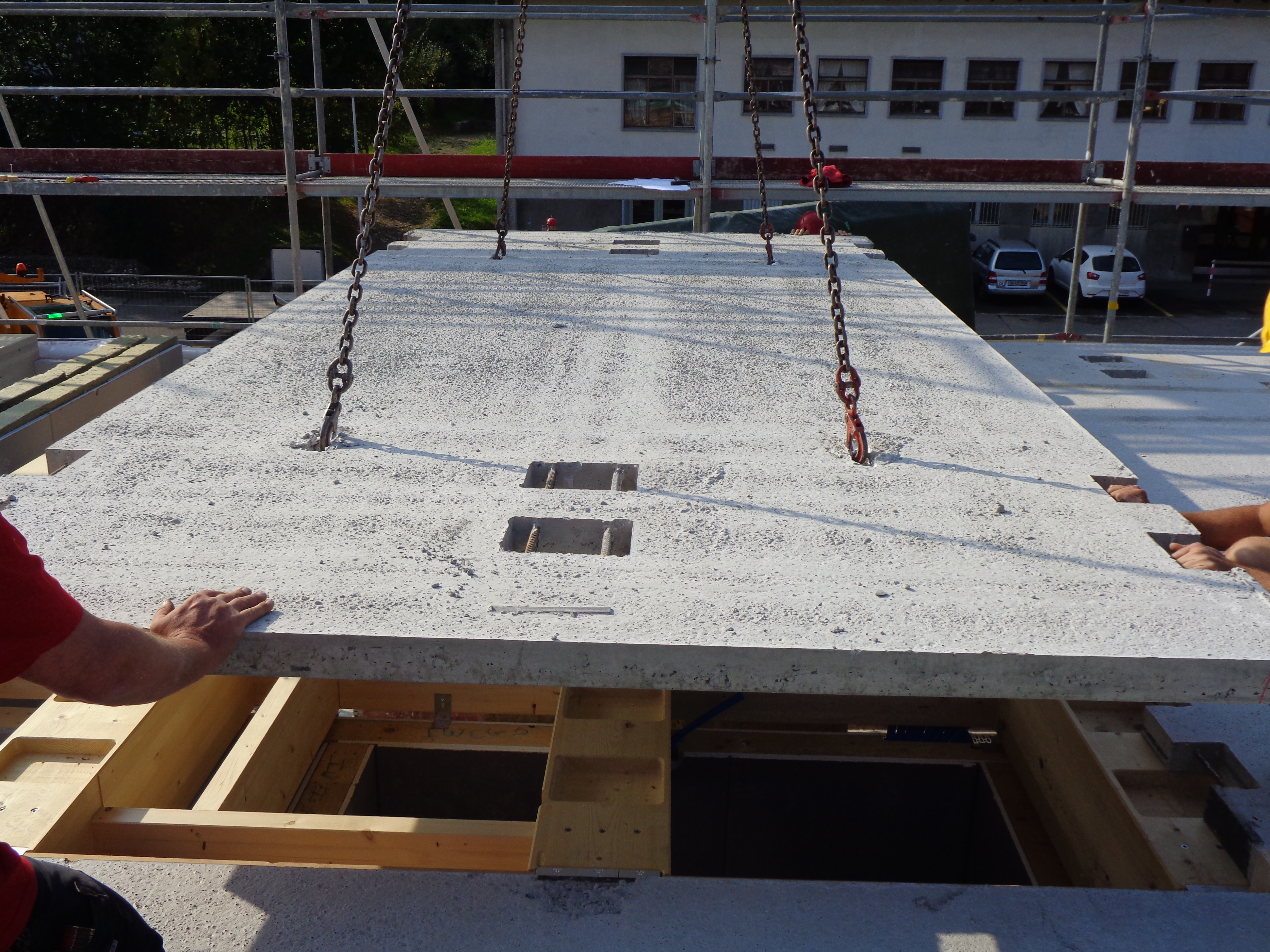 Nun entstehen zwei neue Stöcke in Holzbauweise, erstellt durch Hürzeler Holzbau. Die Decken werden dabei mit dem System Wilma erstellt. Nach der Fertigstellung wird es im EG drei Wohnungen mit Büros geben und im 1. OG zwei Wohnungen mit Terrassen.